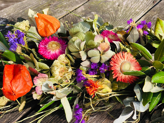 Wij creëren unieke en duurzame ontwerpen met oog voor de natuur. Met bloemen uit onze eigen tuin stimuleren we biodiversiteit. Daarnaast recyclen we materialen voor onze workshops, waardoor we niet alleen prachtige creaties maken, maar ook bijdragen aan een groenere wereld.