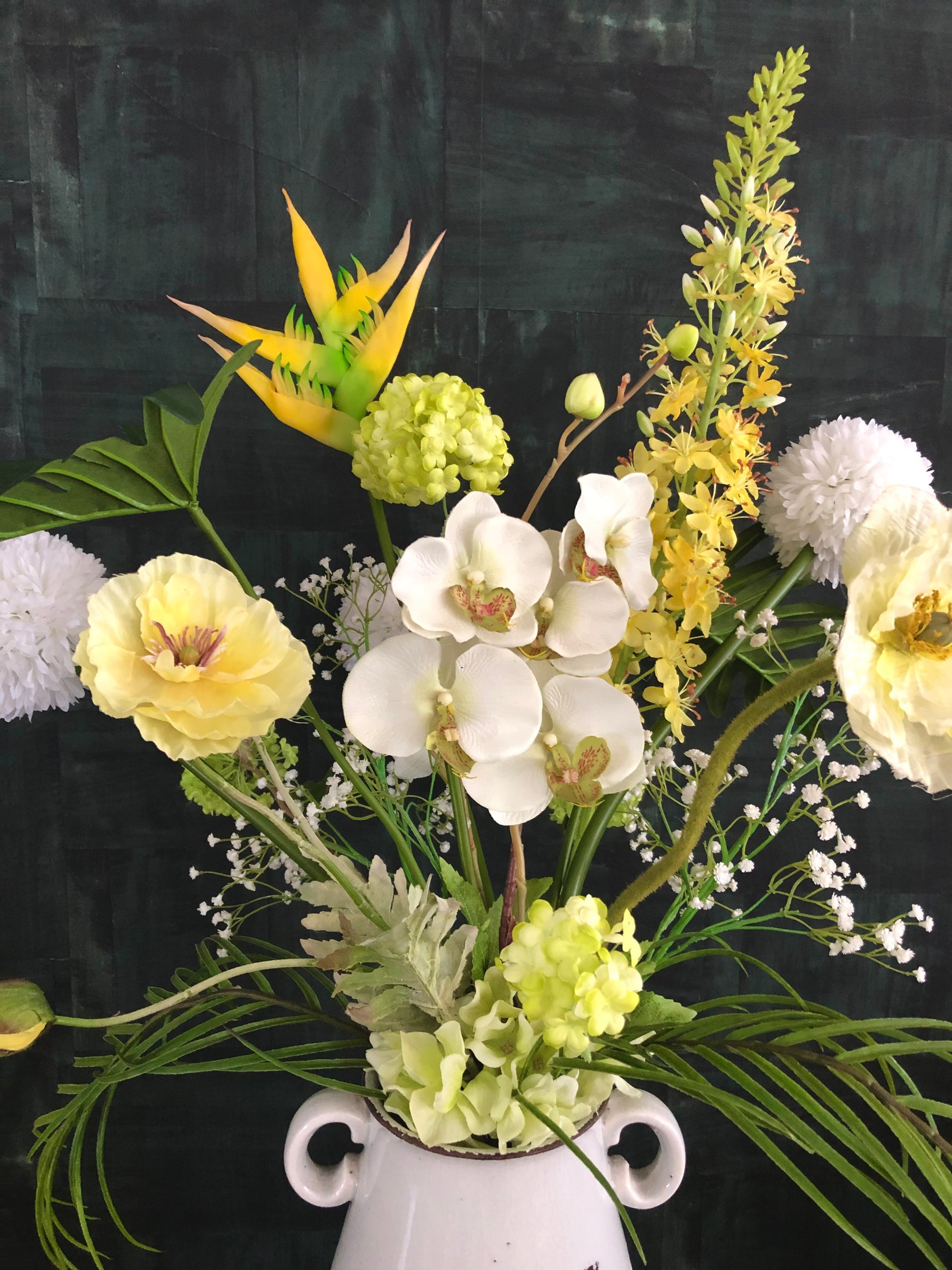 Dit mooie warme zijden boeket fleurt ieder interieur op! Door de neutrale tinten in combinatie met zacht geel en ietwat feller geel maakt het een sprekende uitstraling.
